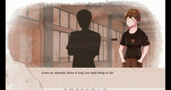Amanda's character and subsequent character arc are perfectly encapsulated in the game design. For instance - Amanda and Peter are the only ones with visible sprites, while the others are depicted merely as black silhouettes, highlighting the distance that Amanda feels from them. Furthermore, even while talking with her friends (whose names are mentioned in the script), in the speaker box the friends are still referred to as "Classmate 1/2," reinforcing that Amanda does not feel close to others, even people that she calls her friends.
